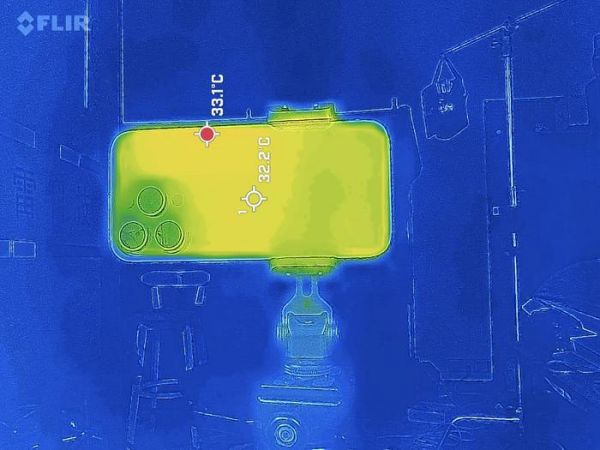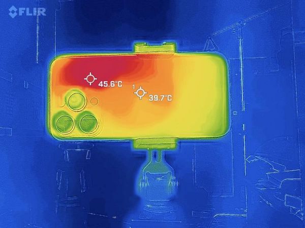图片来源:雷科技而iOS 17.0.3版本下,WLE压力测试期间iPhone 15 Pro背面中心温度从32度上升到39.7度,背面最高温度为45.7度。最高温度出现的时间也从iOS 17.0.2版本的17分钟延后至19分半,此外手机正面温度也有明显下降。