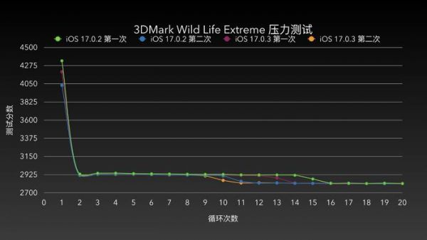图片来源:雷科技但在17.0.3版本下,iPhone 15 Pro的标定出现变化。尽管测试中iPhone 15 Pro同样是第二轮中才出现明显的分数下降,但第一轮循环稳定4200分的情况其实也说明问题——iOS 17.0.3确实从一定程度限制了iPhone 15 Pro性能表现。