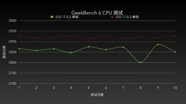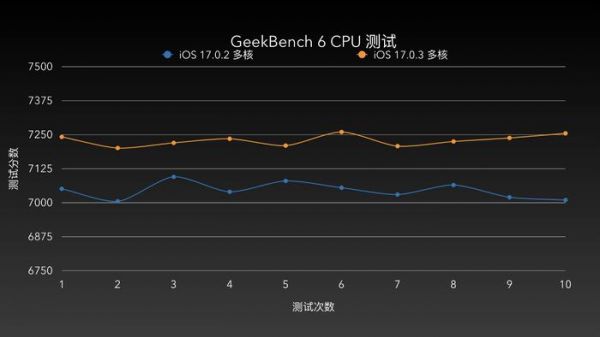 而相对较短、压力也更低的GeekBench CPU测试就不一样了。在两次测试使用散热器充分散热,保证每次测试独立性的前提下对两个系统版本的iPhone 15 Pro进行10次CPU测试,可以看到iOS 17.0.3版本下的iPhone 15 Pro无论单核成绩还是多核成绩,和iOS 17.0.2版本的分数相比均有所提升。