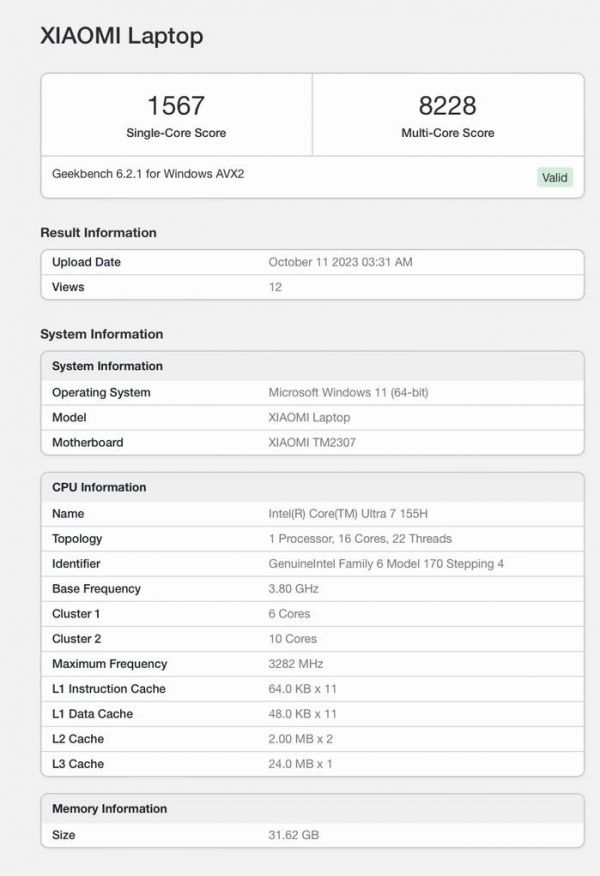 IT之家 10 月 14 日消息,小米新款笔记本(TM2307)现已现身 Geekbench,搭载英特尔即将发布的酷睿 Ultra 7 155H 处理器。
