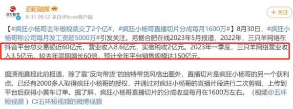 据合肥本地媒体报道,2022年,三只羊网络在抖音平台总交易额近60亿元,营业收入8.6亿元,实缴税收2亿元。2023年一季度,公司营收达3.5亿元,较2022年同期增长60倍。