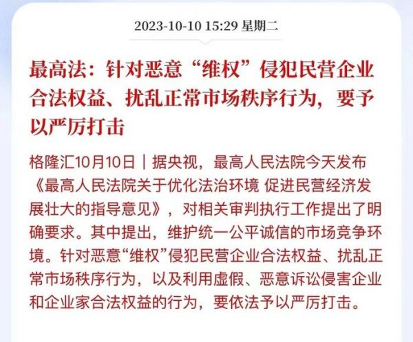 最近,最高人民法院又发布了《最高人民法院关于优化法治环境 促进民营经济发展壮大的指导意见》,明确指出了“以及利用虚假、恶意诉讼侵害企业和企业家合法权益的行为,要依法予以严厉打击”。