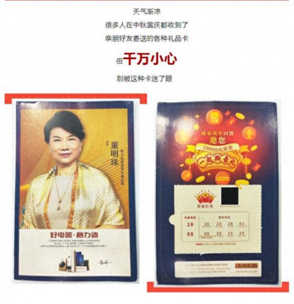 10月10日,市民王先生爆料称,他收到了一份陌生寄件人寄送的快递,里面包含一包厨房湿巾和一份印有格力电器董事长董明珠照片的中秋礼品卡,“邀请”王先生“值此中秋国庆佳节暨格力公司成立三十二周年来临之际”参加“一起撕豪礼”的刮奖活动,“最高可获得10000元现金奖励”。凑巧的是,就在王先生收到礼品卡的前一日,他的朋友罗先生也收到了相同的礼品卡。