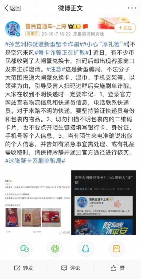 在#孙艺洲称疑遭新型蟹卡诈骗#的话题冲上热搜后,上海市公安局紧急发文提醒,称近日有不少市民都收到了大闸蟹兑换卡,扫码后却出现客服窗口发来进群邀请。这是新型骗局,不法分子大范围投递大闸蟹兑换卡、湿巾、手机支架等,以领奖为由,引导受害人扫码进群后实施刷单诈骗。