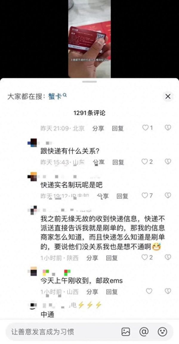 根据网友反映,不法分子在寄送蟹卡时有不少用的是邮政、韵达和中通。8日,中新经纬分别咨询了这三家快递公司,其中中通客服人员称,客户信息是保密的,公司工作人员正常是不会泄漏的。韵达客服人员也称,公司不会泄漏客户信息。