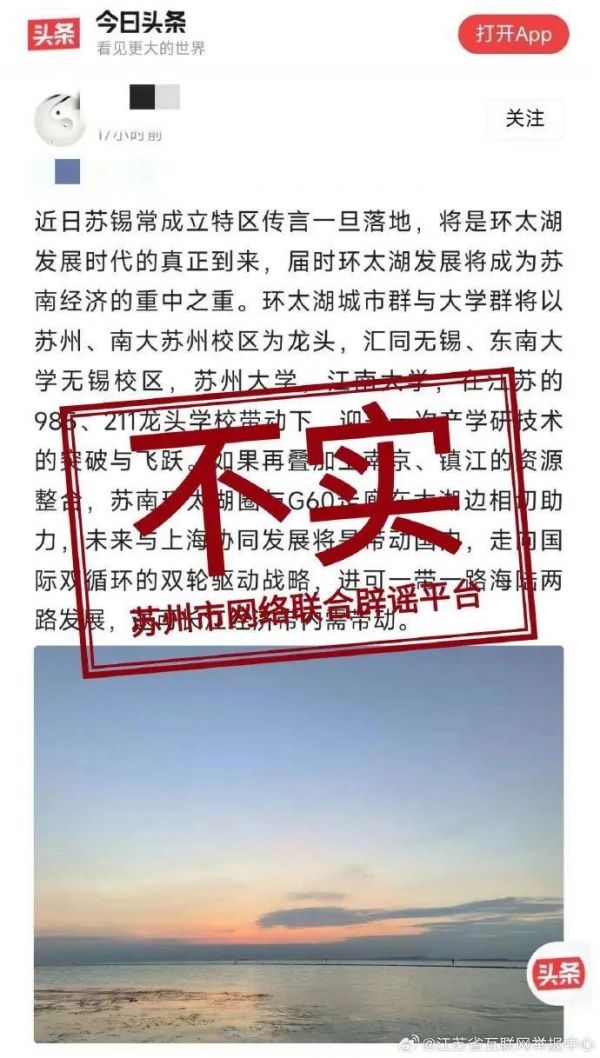 据江苏省互联网违法和有害不良信息举报中心官方微博14日消息,近日,有网络传言称“苏锡常将设立‘经济特区’”,经向有关方面了解,此信息内容不实,为个别网民杜撰编造。