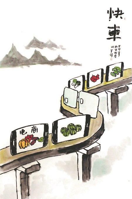 看到此处,这幅作品的思想价值也便随着四通八达的“道桥”进入读者脑际。科技也好,电商也好,现代化也好,不仅服务于市民,更应该造福乡村百姓。毕竟,农村生活质量和品质,更能检视社会整体发展水平。