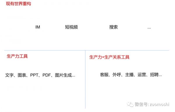 我们这世界的产品格局在互联网时代已经被塑造过一遍了。越是和过去的贴近,越是属于原来的阵营,AI从形成应用力量的角度看,还是过于弱小,不具备这类颠覆的力量。AI能把抖音重做么?在这里产品整个的权重是100的话,AI的权重可能只有不到10。