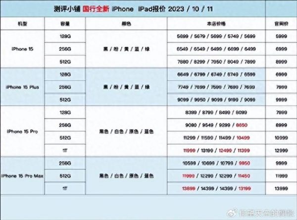 10月14日消息,测评小铺晒出了iPhone 15国行第三方渠道报价,512GB顶配版黑色价格是7880元,比首发价便宜1119元。