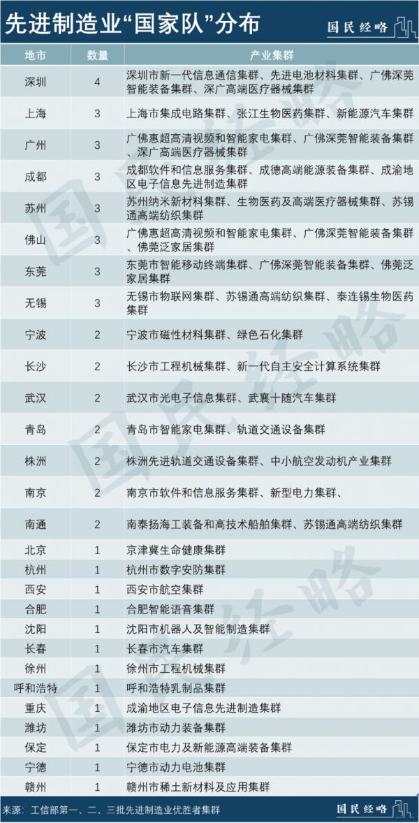 从先进制造业集群来看,目前,我国共发布45个先进制造业集群优胜者,成都共有3个集群跻身其中——成都软件和信息服务、成德高端能源装备、成渝电子信息先进制造业集群,总量仅次于深圳,与上海、广州等并列。
