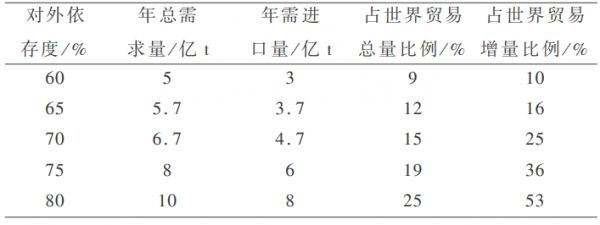 表1 2030年不同对外依存度条件下石油供需平衡表