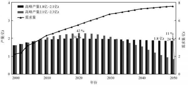 二是我国已开发主力油田总体已进入“高含水、高采出程度”的“双高”开发阶段,大多数主力油田已进入产量递减期,每年新增的探明储量绝大部分要用来弥补产量的递减。如果近期把原油产量提得过高,必然提前动用未来储量,其结果将会导致后期产量递减速度更快(见图1)。