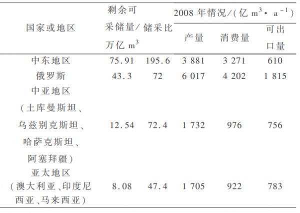 在地理位置上,我国毗邻中亚-俄罗斯、中东和澳大利亚-印尼等三大富气中心。据英国石油公司统计数据分析,上述三大富气区2008年天然气可供出口的能力接近4000亿 m3(见表2)。无论通过陆路的管线进口,还是通过海上LNG进口都相对比较便捷,具有多元化利用国外天然气资源的地域优势,我国应注重发挥这种优势,抓住有利时机,加大国外天然气资源利用力度。通过加强与资源国的合作,力争2030年我国天然气进口量达到1500亿 m3以上,2050年进口量达到2500亿 m3以上。