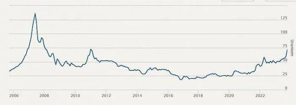 2005年1月-2023年9月铀现货月度价格变化。图片来源:卡梅科公司(Cameco),数据来源:UxC