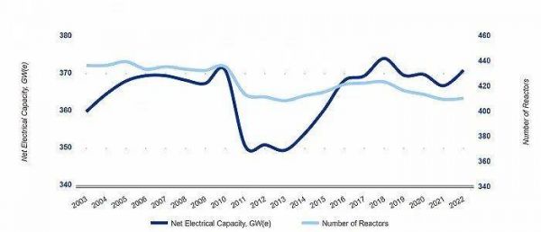 据国际原子能机构(IAEA)数据,全球核电装机容量在2011年同比下滑5.5%至351 GW,但从2014年开始逐步回升,到2018年达到374 GW,超越了2010年的371 GW,之后有所回落,到2022年全球核电装机容量再次增加,截至年末约为371 GW。