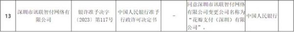 10月13日,中国人民银行更新非银行支付机构重大事项变更许可信息,同意深圳市讯联智付网络有限公司(以下简称“讯联智付”)变更公司名称为“花瓣支付(深圳)有限公司”(以下简称“花瓣支付”)。