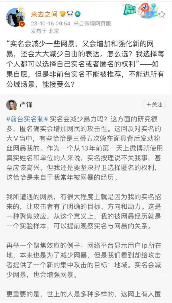 因此,围绕微博百万大粉前台实名制度,起码有十种以上的讨论模式和观点对撞: 一边是支持者拍手称快,坚信这是整治键盘侠的良方;一边是审慎者惶恐不安,担忧这不过是兔死狐悲的开端。