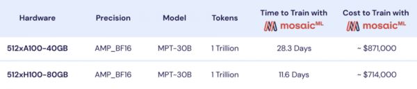 MPT-30B是第一个使用H100训练的开源LLM(大语言模型),实际训练只耗费了11.6天;相比之下,使用前一代的A100训练则需要28.3天[7]。如若换成参数规模更庞大的AI,例如1800B的GPT-4,效率差异会更加明显。跑马圈地的时代,时间就是一切。