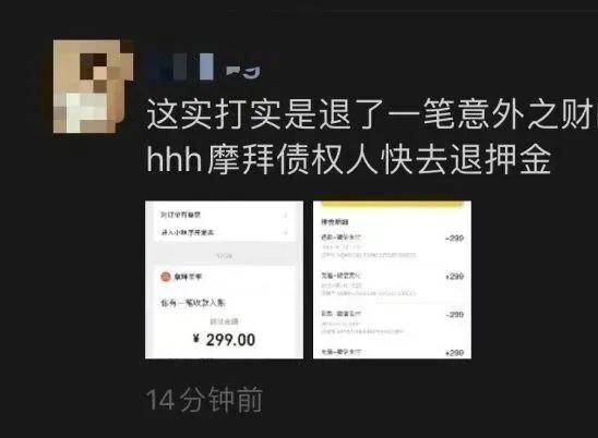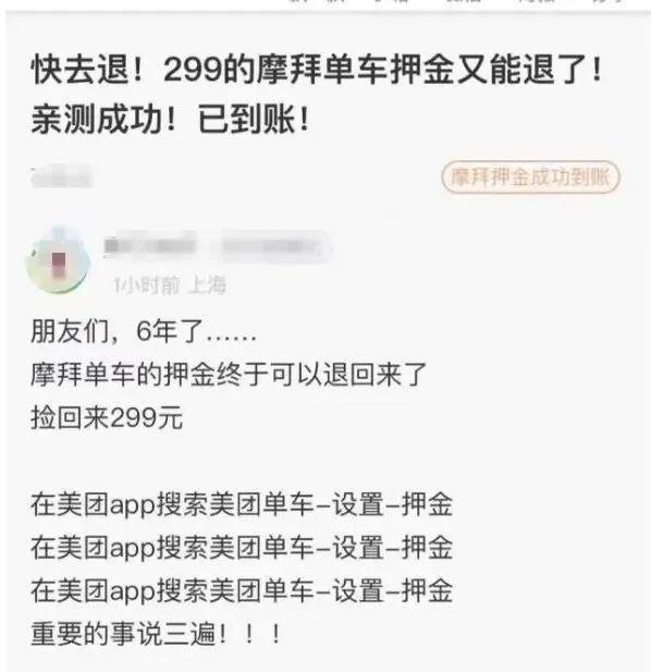 最近,看到多名网友在社交平台上分享如何成功拿到摩拜单车押金教程后,李先生也抱着试试看的心态进行了操作,没想到微信很快就收到了来自美团的299元押金退款。