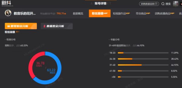 新抖数据显示,在“教音乐的花开富贵”789万粉丝中,男粉占比超过63%,31岁到40岁的中年人是主力军,其直播观众男性与女性各占一半。