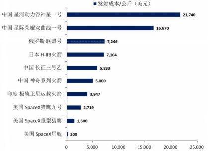 其中最为关键的是我国火箭发射成本控制水平相较美国仍有较大差距,降本路径主要受限于低成本推进剂、回收复用和“一箭多星”等技术难点。此前马斯克就曾透露,星链卫星制造成本约在50万美元/颗,而国内低轨通信卫星的平均造价约在3000万元;再看卫星发射成本,Space X使用猎鹰火箭的单星发射成本约为50万美元,远低于国内发射成本。