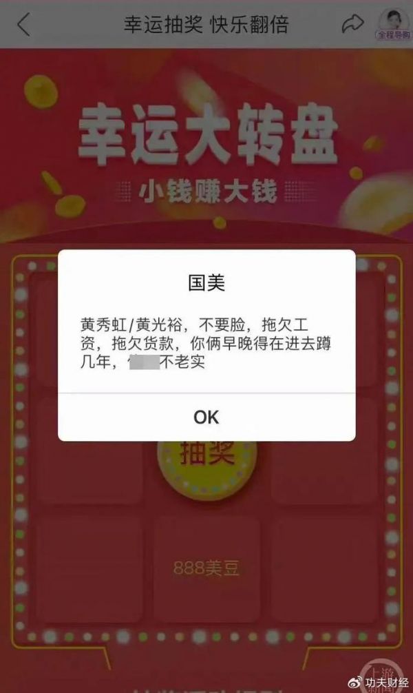 10月15日,网传截图显示,点开国美 APP“幸运大转盘”抽奖页面后,有弹窗提示惊现辱骂国美电器董事长电器董事长黄秀虹、创始人黄光裕的内容,指控其拖欠工资、拖欠货款,“早晚得再进去蹲几年”。