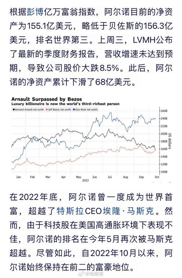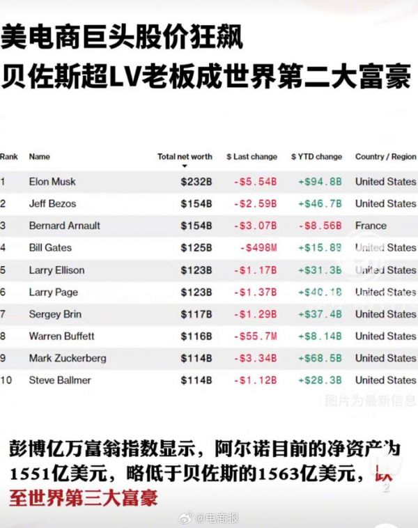 #贝佐斯超LV老板成世界第二大富豪# 身价大涨3600亿元,亚马逊创始人贝佐斯重夺全球第二大富豪,LV老板跌至第三。