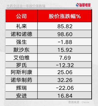 在TOP 10阵营中,仅辉瑞、罗氏及强生股价呈现下跌趋势,其余药企均上涨,包括面临老药王修美乐被围剿的艾伯维,过去一年仍上涨了7.7%。