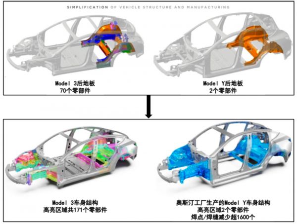 (图:采用一体化压铸的Model Y与Model 3对比,焊点减少了1600个)