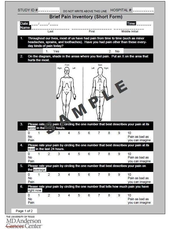 直到八十年代后期,查理斯·克里兰教授(Charles S. Cleeland)发明了简明疼痛量表(Brief Pain Inventory, BPI)。采用1至10的疼痛指数,让患者根据自己的疼痛感受,来报告他的疼痛程度,并以此来治疗疼痛。他用这种非常简单的方法,让疼痛作为主观的症状变得可以量化。
