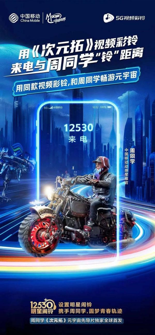 比如,借势周同学的IP,中国移动持续创新数智化融合产品,引导用户通过视频彩铃、咪咕视频、移动高清“视频铁三角”,观看相关节目,并进入元宇宙鼓浪屿感受数实融合互动等,不少粉丝都通过12530明星闹铃预约设置,尝鲜观看周同学《次元拓》元宇宙先导片,并设为自己的专属视频彩铃。