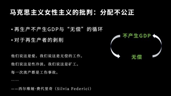 马克思主义女性主义提出再生产这个概念,恰恰是要提出这样一种批判:再生产没有回报,是我们今天这个社会里面的一种最大的分配不公正。这里面存在着一个无限循环:再生产得不到回报是因为它不产生GDP、不产生任何财富,因此大家就认为再生产活动不应该得到回报。所以它就变成一个无偿的活动。