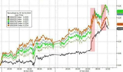 10年期美国基债收益率最高升超15个基点至4.86%,30年期长债收益率最高涨12个基点上逼4.99%,均创10月6日以来新高,并接近2007年来高位。五年期美债收益率涨近18个基点。