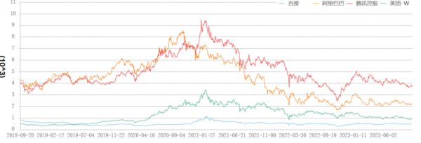 这个局面一直持续到2019年5月,美团崛起。当时美团已经在外卖、本地生活奠定江湖地位,获得资本市场看好。5月市值超过百度之后,美团进一步将差距拉大,随后几年市值一直是百度的3倍左右。