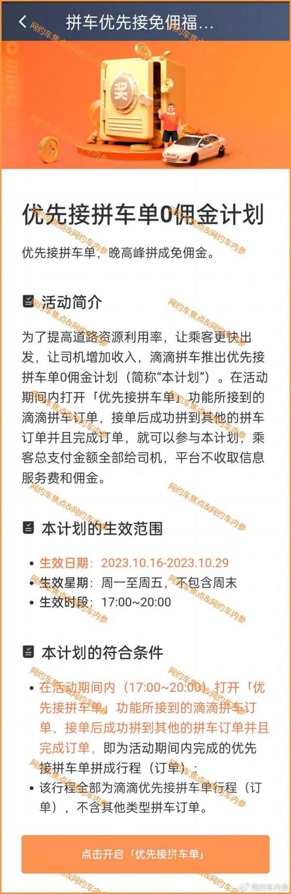 参与0佣金计划的需要是快车司机,并获得拼车订单接单资质。行程满足计划条件的,在行程页面会有“拼车0佣金计划”和“优先接拼车单”标签。