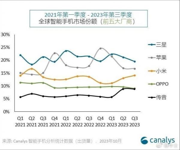2023第三季度全球手机市场份额出炉,小米第三,vivo掉出前五