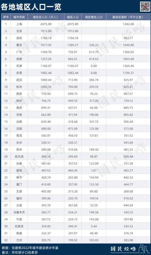 日前,住建部发布最新统计年鉴,透露各地2022年城区人口数据。