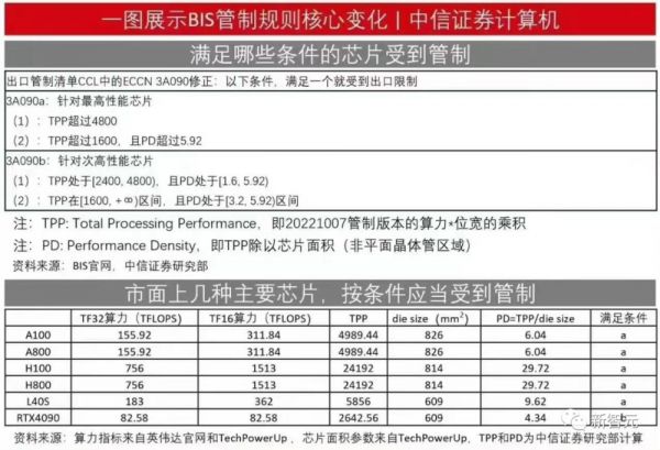 如果速度为150~300 TFLOPS的芯片的“性能密度”为每平方毫米370 GFLOPS(十亿次运算/秒)或更高,则将被禁止销售。
