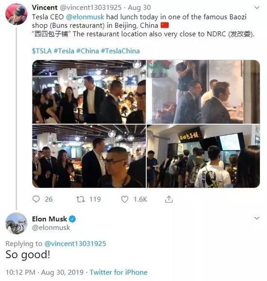 就在双马谈话热度还没下去之前,马斯克又打了个“飞的”,专门到北京吃了一顿包子,并且还在Twitter上面安利“好吃”(so good)。