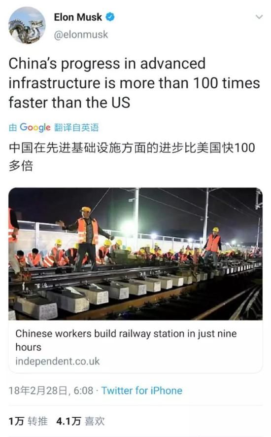 在看完视频之后,马斯克在Twitter上面转发视频并狂赞:“中国基建效率是美国的100倍!”