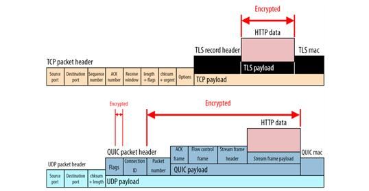 图2:TCP+TLS和QUIC之间的加密差异。QUIC加密的不仅仅是HTTP数据。此外,由于QUIC的加密更加广泛,因此比TCP更容易更改或添加新功能——我们只需要更新客户端和服务器,因为中间设备无法解密元数据。因此,QUIC成为了一种面向未来的协议,可以让我们更快地解决新的挑战。