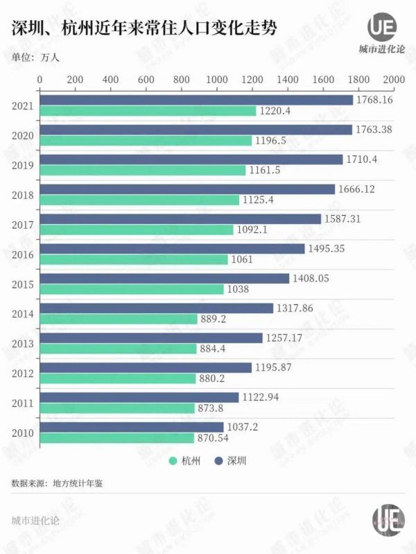 从过去几年的人口增长情况来看,尽管杭州人口增长在少数年份(2015年)快于深圳,但总的来看两市人口总量差距不断拉大。到去年,在自然增长率走低等因素的影响下,杭州常住人口增长率仅为1.41%,尽管跑赢全国大盘,但仍是多年新低。