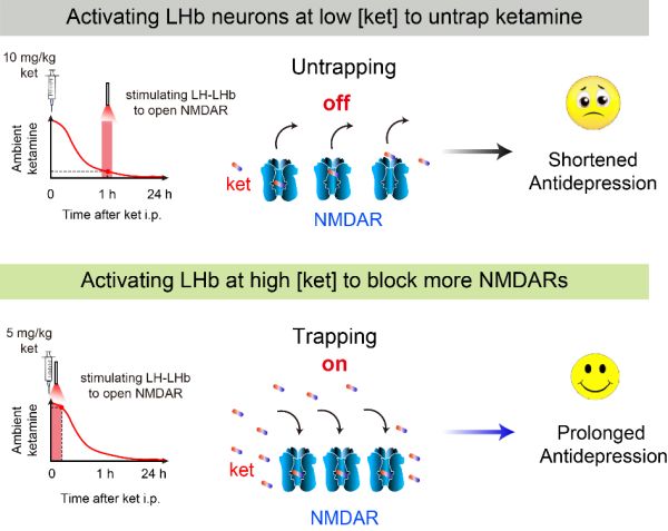 这样一个双向调控实验提示:氯胺酮的药效时长可以被外侧缰核神经元的激活时机所调控。