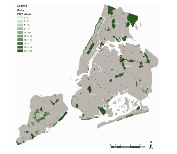 运用地理信息系统,根据“”儿童友好的公园品质指数” 绘制的纽约地图。 据此可以判断儿童友好城市的品质 (引用:A. Rigolon, Jeremy Nemeth A QUality INdex of Parks for Youth (QUINPY): Evaluating urban parks through geographic information systems)
