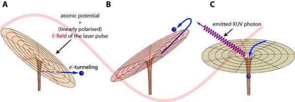图3:再散射模型(或三步模型)。在强激光场的作用下,原子中的电子发生隧穿电离,在强电场的作用下回归,并与母离子复合,能量以高次谐波的形式往外发射。| 图源:Nanophotonics 2015; 4:303–323