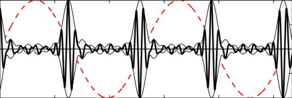 图2. 阿秒脉冲链(黑实线)与飞秒激光的电场振动(红虚线)。每个阿秒光脉冲相隔半个电场振动周期,形成阿秒脉冲链。| 图源:https://www.researchgate.net/publication/241772054