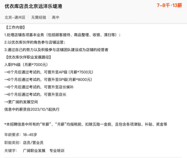 这一“预告”与优衣库部分门店目前的招聘信息相符,有些门店应该是收到内部调薪通知后,便修改了对外的薪资范围,这些门店并高亮表示“以上薪资均自2023/10/1起执行”。