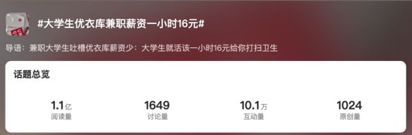 有位实习生吐槽优衣库“把大学生当廉价劳动力”。在优衣库实习不仅薪资低,同时需要兼职保洁。“大学生就活该一小时16元给你打扫卫生?”舆论发酵后,这条吐槽登上微博热搜。