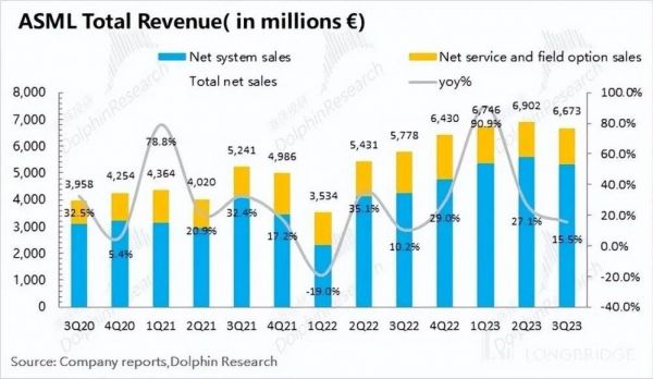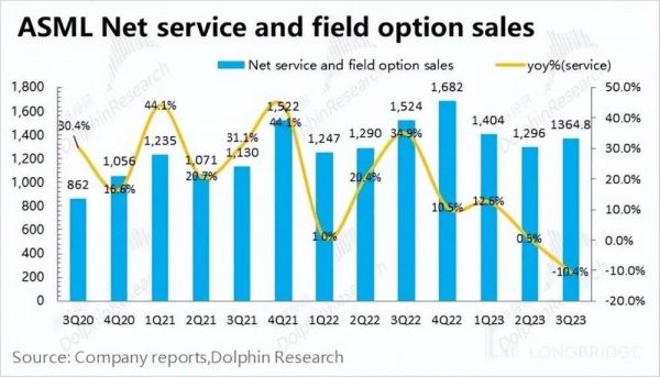 阿斯麦(ASML)的服务收入在 2023 年第三季度实现 13.65 亿欧元,同比下滑 10.4%。阿斯麦的服务收入,主要包括设备维护等项目,业务收入保持相对平稳。