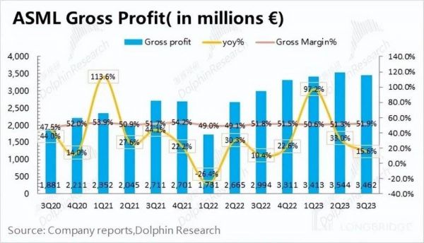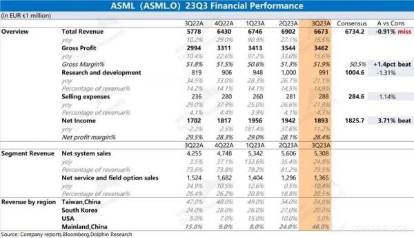 1. 核心数据:基本符合预期。$阿斯麦.US 在 2023 年第三季度实现营收 66.73 亿欧元,略低于市场预期(67.34 亿欧元)。虽然中国大陆客户本季度大幅拉货,但还是抵不住其他地区客户需求减弱的影响。公司在 2023 年第三季度净利润为 18.93 亿欧元,同比增长 11.2%,略超市场预期(18.25 亿欧元)。毛利率的超预期回升,支撑住了本季度的利润。